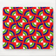 This mouse pad has a Bauhaus design of quarter circles in blue, yellow, green, and white on a field of red.