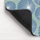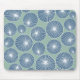 This mouse pad has a mid-century modern design of dusty blue circles with white starbursts inside on a field of seafoam green.
