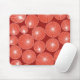 This mouse pad has a mid-century modern design of red circles with white starbursts in them, all on a field of brick.