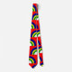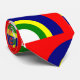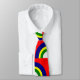 This tie has a Bauhaus design of quarter circles in blue, yellow, green, and white on a field of red.