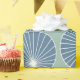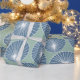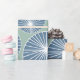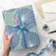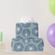 This wrapping paper has a mid-century modern design of dusty blue circles with white starbursts inside on a field of seafoam green.