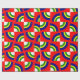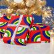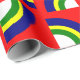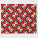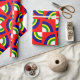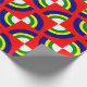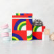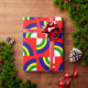 This wrapping paper has a Bauhaus design of quarter circles in blue, yellow, green, and white on a field of red.
