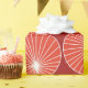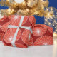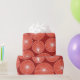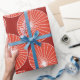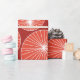 This wrapping paper has a mid-century modern design of red circles with white starbursts in them, all on a field of brick.