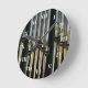 Roman numerals in white lettering on top of silver beaten metal organ pipes, with delicate hues of gold and green reflected in the metal.