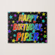 This exciting and lively birthday-themed jigsaw puzzle design has the message "HAPPY BIRTHDAY, PIPER" with the characters having a colourful rainbow spectrum inspired gradient pattern, along with a vibrant field of stars background pattern. A vibrant puzzle like this might be a fun way to send birthday greetings to somebody named Piper. [~Z0000468]