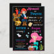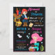 This two theme Pirate and Mermaid birthday invitation for two kids is for combined birthday party! It features cute little pirate with pirate ship and chest of gold and beautiful little pink haired mermaid.