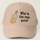 Great for "Talk LIke a Pirate Day" on September 19th! All pirates ask that famous question, "Why is the rum gone?" Hat features a half- empty bottle of rum. Colour and style of hat is customisable.