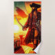 This beach towel has a pirate pictured on it.