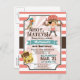 Ahoy, Mateys! Fun, cute nautical sea pirate theme children's, girl's birthday party invite on coral pink and white stripes pattern. Features pirate girl with boots, eye patch, pigtails, and polka dot bandanna with pirate parrot, bird, and gold treasure chest. Second, 2nd, birthday can be personalised to first, 1st, or other birthdays for toddlers, kids, or babies, baby, etc. Colours include coral pink, brown, teal blue, yellow, and white.