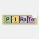 The word Pirate spelled using colourful squares representing elements from the periodic table. A cute gift idea for anyone that loves pirates, especially if they also have an interest in science or chemistry. Great for 'talk like a pirate day' too! Phosphorus + Iodine + Radium + Tellerium = PIRaTe