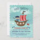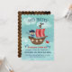 Ahoy Matey! Climb aboard for a swashbuckling adventure with this adorable ocean and pirate themed birthday party invitation. Bright colours and bold graphics on a sea of aqua. Back of invitation is a dark wood grain pattern.