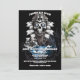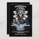 A striking 3D ai watercolor graphic of a skull fitted to a metal post. It is surrounded by a black background and has blue ocean waves lapping up against it on which a pirate ship can be seen. The skull has diamonds for eyes and has a spooky appearance. Editable white templates for your custom wording appear below the illustration which is ideal for adults and teens hosting an ahoy matey pirate themed nautical party.