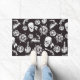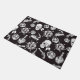 White graphics of skulls & pirate elements on black background, seamless repeat pattern