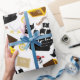 Pirate motifs of treasure chest, skull and crossbones, treasure map, pirate ship. Background colour can be changed to your choice.