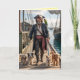 A cute dog greeting card that features a pirate with a parrot walking his small dogs on a dock.