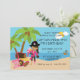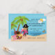 This cute pirate girl birthday party invitation features a girl dressed as a pirate with a hook hand and a peg leg on the beach under a palm tree with her treasure chest full of gold. Her pirate ship can be seen anchored offshore in the ocean.
