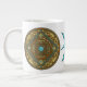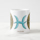 This Pisces themed mandala features an aquamarine stone surrounded by the symbol for the sign, the constellation, and the alchemical symbol for Water among filigree and weaves. This mug is available in jumbo, espresso, and bone china sizes and styles.