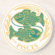 Pisces sign of the zodiac in green and white on a sandstone coaster.