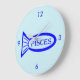This awesome clock features an outline of a blue fish with pretty detailing inside. There is also text that says Pisces inside the outline of the fish. This design is ideal for people with Birthdays Between 19 February and 20 March.