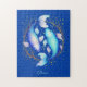 Puzzle in an illustration of the zodiac sign Pisces featuring two gracefully intertwined blue and purple koi fish, reflecting duality, deep emotions, and a connection to dreams, spirituality, and the subconscious.