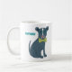 This custom coffee mug features an illustration of a handsome pup. This dapper dog is wearing a pair of teal coloured glasses and a lime green bow tie. Beside the pit bull puppy graphic is a spot to add a name in coordinating teal letters.