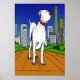 A white Pit Bull Terrier with a red nose in the park in the city, blue sky, skyscraper in the city, Cartoon style art. This is a AI generated art.