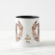 A pretty autumn wreath in tones of cinnamon brown, tan, and cream surround the watercolor image of a brown and white Pitbull Dog. The image is printed twice on the mug, with your custom text between them.