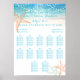 PixDezines seating chart, featuring turquoise blue ocean with white sandy beach, strings of lights and a white chandelier silhouette. We accented with removable mint green and coral orange starfish. PixDezines' designs allow you to edit any elements of the design.