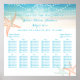 PixDezines seating chart, featuring turquoise blue ocean with white sandy beach, strings of lights and a white chandelier silhouette. We accented with removable mint green and coral orange starfish. PixDezines' dynamic designs allow you to edit any elements.