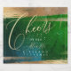 PixDezines an elegant modern calligraphy Cheers, iridescent emerald teal label and Faux Gold brush strokes.  Accented with "Mr. & Mrs." script font for mini sparkling wine label.   Green iridescent background.