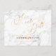PixDezines white marble faux gold foil elegant calligraphy script font with DIY engagement photo save our date postcards, accented with ink splatters in faux gold.