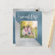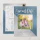 PixDezines modern geometric shapes with DIY colours in platinum silver and slate blue save the date postcards with faux foil in platinum and silver confetti and fun modern calligraphy script. DIY background colour. Customise it!