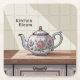 This coaster features a decorative teapot on a wooden counter, with the text Kitchen Bloom in black letters. The teapot is white porcelain with a pink rose design and green leaves painted on the side. The teapot has a silver-coloured handle, spout and lid knob. The teapot sits on a light brown wooden counter with visible wood grain texture. The image was created in a pixel art style. Behind the teapot is a beige tiled wall with a diamond pattern. The coaster is a square paper pulp coaster. The coaster set contains six coasters.