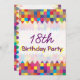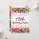 Birthday party invitations with a rainbow pattern of funky square pixels.