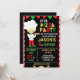 Cute invitation for young chef's birthday party featuring pizzas, blonde boy chef and some cooking equipment.