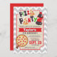 Pizza party birthday party invitation for boy or girl. Invite features grey and white chevron pattern, pepperoni pizza slices, and red back.