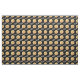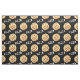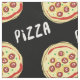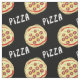 This fabric features a pattern of pepperoni pizzas against a black background.