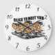 This circular wall clock shows five cartoon pizza slices, each with a baseball cap and shoes, celebrating on top of a pizza. The phrase "SLICE TO MEET YOU" is shown in black at the top. The background is white.