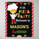 Cute party sign for young chef's birthday party featuring redhead boy chef and some cooking equipment.