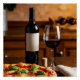 A mouthwatering still life poster showing a delicious pizza topped with mozzarella, pepperoni, tomato sauce, and basil on a wooden board. Accompanied by a bottle of red wine and a filled glass, set on a rustic wooden table. Perfect kitchen or dining room wall art for lovers of Italian food and cozy meals.