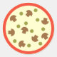 This cute and fun sticker will make anyone's day! The round sticker looks just like a pizza with brown sliced mushrooms, green olives, and cheese on a tomato sauce topped crust.