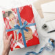 This Great Dane dog is dressed for the holiday season in a striped winter scarf and sits against a red and white plaid patterned background.