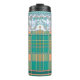 A feminine plaid print in coral peach, greens and turquoise. Trimmed with delicate white lace with a turquoise pearls.
