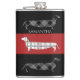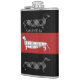 Stylish and quirky personalised hip flask for Dachshund dog lovers with elongated, plaid pattern sausage dogs on modern bold red and black stripes.