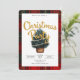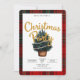 This card is for a Christmas party invitation. It features a festive design with a plaid border in traditional Christmas colours of red, green, and black. In the centre, there's an illustration of a Christmas tree decorated with soft, glowing string lights. The text reads **"Join us for a Christmas Party"** in bold gold script.