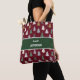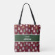Custom all over print tote bag personalised with your monogram name and surname. This cute Christmas tree's design consists of a plaid and stripe patterned Christmas tree's pattern on a maroon background with a dark green stripe crossing it. Simply edit the design by clicking on "personalise this template" and change the text. The text will change on both sides at the same time.