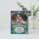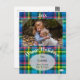 Holiday photo post card with Grey plaid background image. Design by HAMbyWhiteGlove. Blue, yellow, pink.