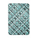 This bath mat features a modern twist on plaid in shades of aqua, teal, black and white.