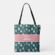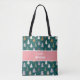 Custom all over print tote bag personalised with your monogram name and surname. This cute Christmas tree's design consists of a plaid and stripe patterned Christmas tree's pattern on a dark green background with a light red stripe crossing it. Simply edit the design by clicking on "personalise this template" and change the text. The text will change on both sides at the same time.