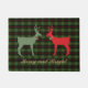 This lovely mat is guarded by two reindeer - one red and one green - set against a green and black plaid background.